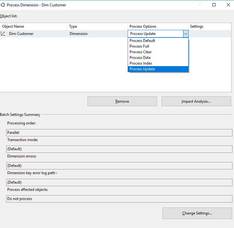 · Process Default: Here SSAS Engine will do minimum work to bring the dimension to a valid state so that it can be used by other objects.