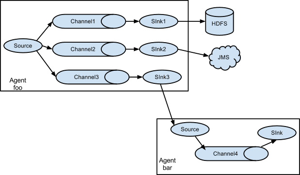 3. Multiplexing (as shown above) - Flume supports multiplexing the event flow to one or more destinations. This is achieved by defining a flow multiplexer that can replicate or selectively route an event to one or more channels.